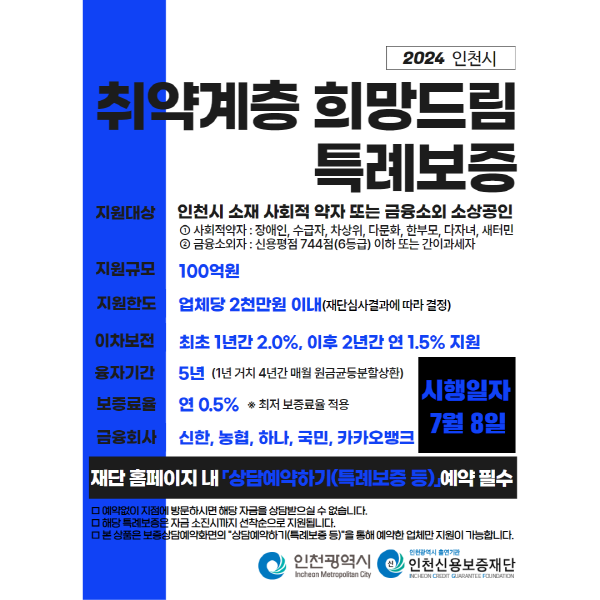 높은 물가상승으로 인하여 경제회복이 둔화되는 요즘 경제적 여건이 좋아야 고비를 이겨낼 수 있는데 금융기관 사업자대출 제한까지 더해져 소상공인들의 손해가 큽니다. 그래서 인천신용보증재단에서는 저신용 저소득 등 취약계층 소상공인의 금융지원을 위해 2024 취약계층 소상공인 희망드림 특례보증을 시행합니다. 오늘 포스팅에서는 인천시에 소재하는 사회적 약자 또는 금융소외 소상공인을 지원대상으로 하는 특례보증 대출에 대하여 알아보겠습니다.